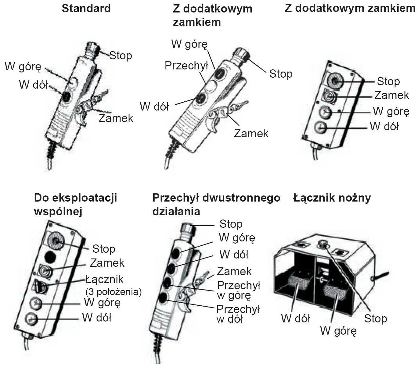 | Z uwagi na różne przypadki zastosowań, stosowane mogą być różne urządzenia obsługowe / sterownicze. Konieczne mogą być dodatkowe wyłączniki awaryjne (analiza ryzyka). Jeśli stosuje się więcej urządzeń sterowniczych, trzeba połączyć je szeregowo. Konieczny jest kabel 5-żyłowy. Na rysynku niżej przedstawiamy powrzechnie stosowane urządzenia obsługowe / sterownicze. | |||