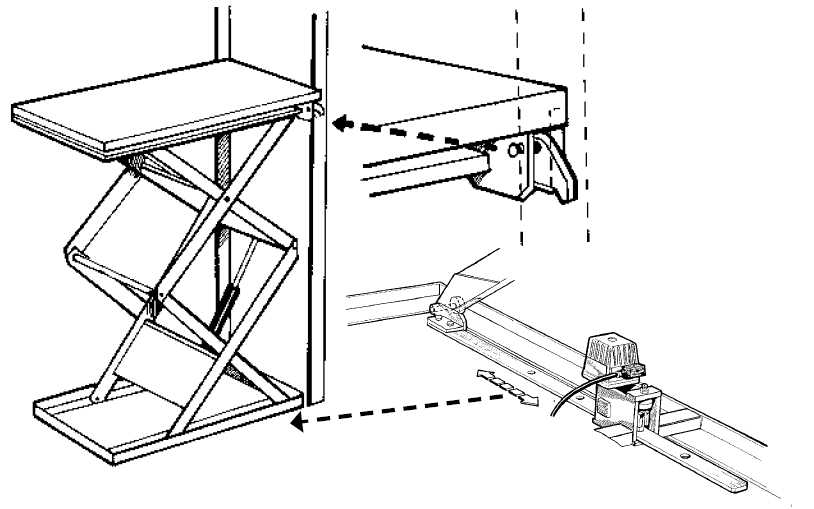 ![]() | Wyłączniki krańcowe przeznaczone do ograniczania ruchów podnoszenia i opuszczania, często w pożądanym najwyższym położeniu, oraz jako przekaźnik sygnału położenia platformy względem dodatkowego wyposażenia. Zalecamy zastosowanie górnego wyłącznika krańcowego zamiast ogranicznika / zderzaka mechanicznego jako górny ogranicznik skoku. Redukuje to ryzyko udarów ciśnieniowych w układzie hydraulicznym, a żywotność podestu wydłuża się. Oprócz pokazanego tu rozlokowania wyłączników krańcowych, może zdarzyć się także inny sposób zabudowy, szczególnie w urządzeniach zautomatyzowanych. | ||